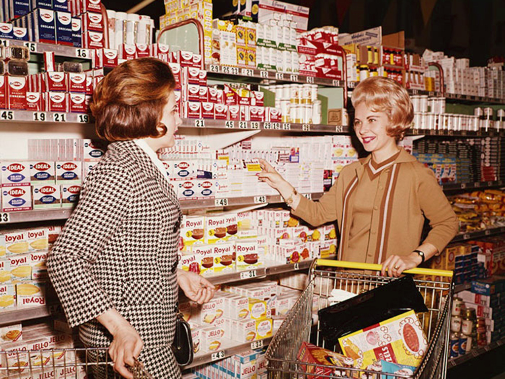 This picture, taken in the early ‘70s, shows off some absolutely fantastic hairdos on the women photoed. You can also catch a glimpse of some vintage packaging and prices for brands like Ritz crackers and Jell-O mixes. And the style of shopping cart is very similar to the carts that are available today, expect most of them were made without kid’s seats in the front.