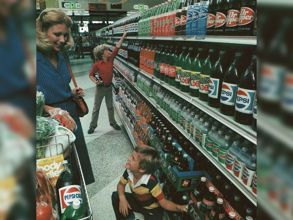 This photo is truly a sight to behold because all of these liters of soda were packaged in glass, not plastic. It’s uncommon to see any beverages still packaged in glass today because plastic is more light weight and less breakable. Those vintage logos on the Pepsi, Mountain Dew and Dr. Pepper bottles are sure to bring back some memories.