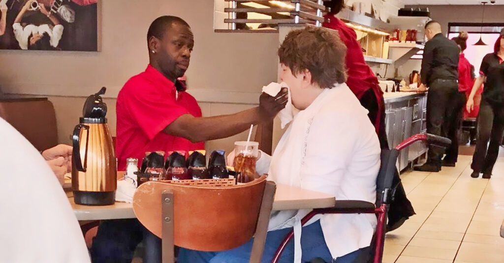 Thomas was bewildered when he noticed that the waiter was feeding the woman, he then even dabbed her mouth with a napkin. What was going on? Thomas couldn’t believe what he was looking at.