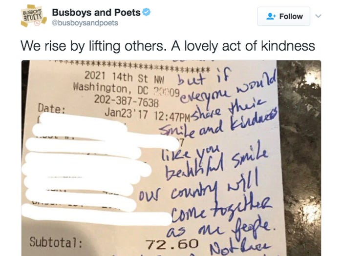 This story went viral after Busboys and Poets shared the photo of the bill on Twitter, writing: “We rise by uplifting others. A lovely act of kindness.”
