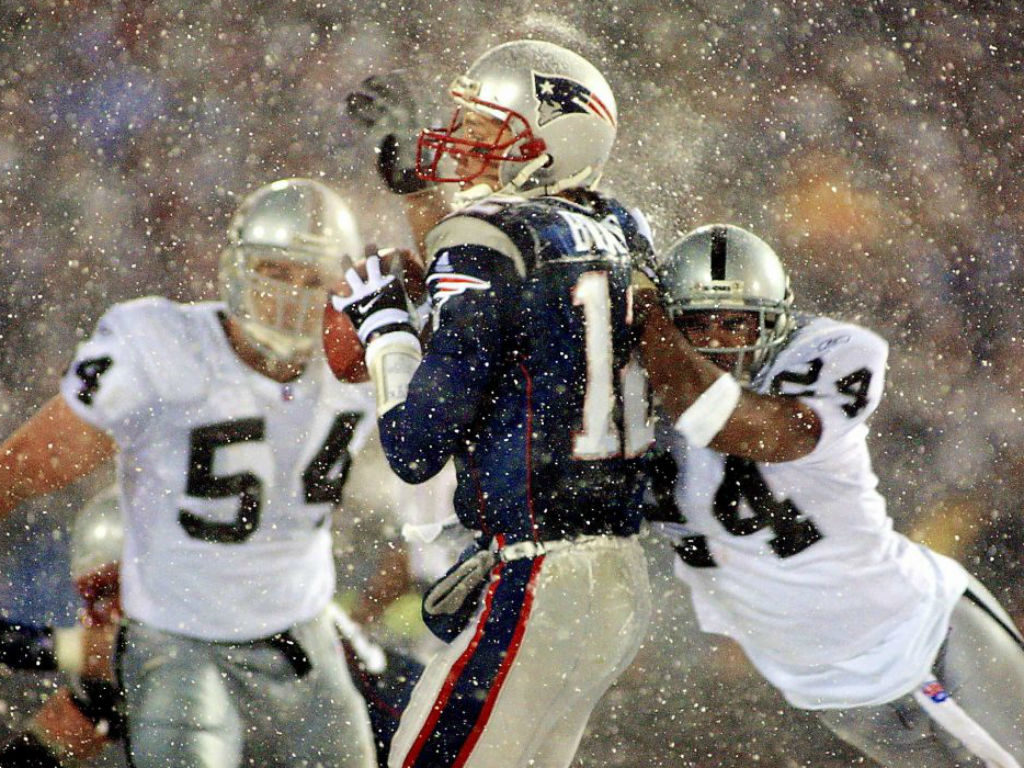In 1999 the NFL instituted the contentious tuck rule, which stated that if a quarterback loses possession of the ball while moving his arm forward in an attempt to tuck the ball back toward his body, it will be ruled an incomplete pass. The rule came into play numerous times before it was repealed in 2013, but never in more dramatic fashion than in a 2002 playoff game in the snow between the Patriots and the Raiders. In the fourth quarter, Raiders cornerback Charles Woodson appeared to force Tom Brady to fumble, but the referees invoked the tuck rule to call it an incomplete pass. The call extended the Patriots’ drive and allowed them to kick a field goal to tie and later win the game in overtime.