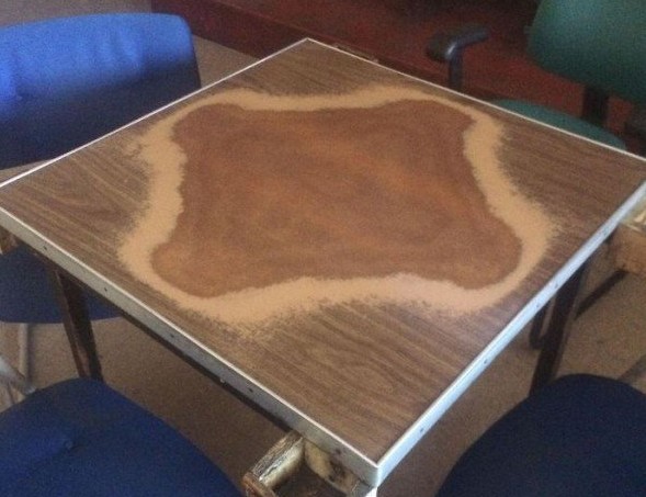 8. You don’t have to look at this table for long to realize that it has been used for years. The pattern on the surface of the table is a result of people playing cards on it. It looks like the pattern has been made intentionally.