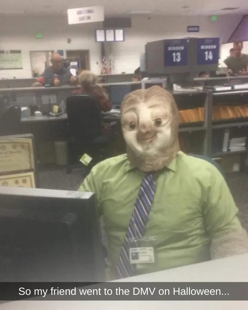 Fortunately, one DMV worker understands the difficulty all too well and chose to poke fun of it by dressing up for Halloween. It’s not just any outfit, though. He donned a Flash the Sloth costume from Zootopia from 2016. Get it? As a result of how slowly DMV lines move!