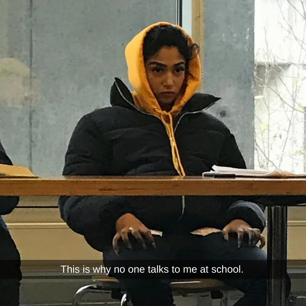 She’s perfectly sweet — when she’s speaking to someone. When she’s by her lonesome, though, it looks as if she hates everything and everyone. After receiving a photo of herself sitting alone in class, she herself realized this.