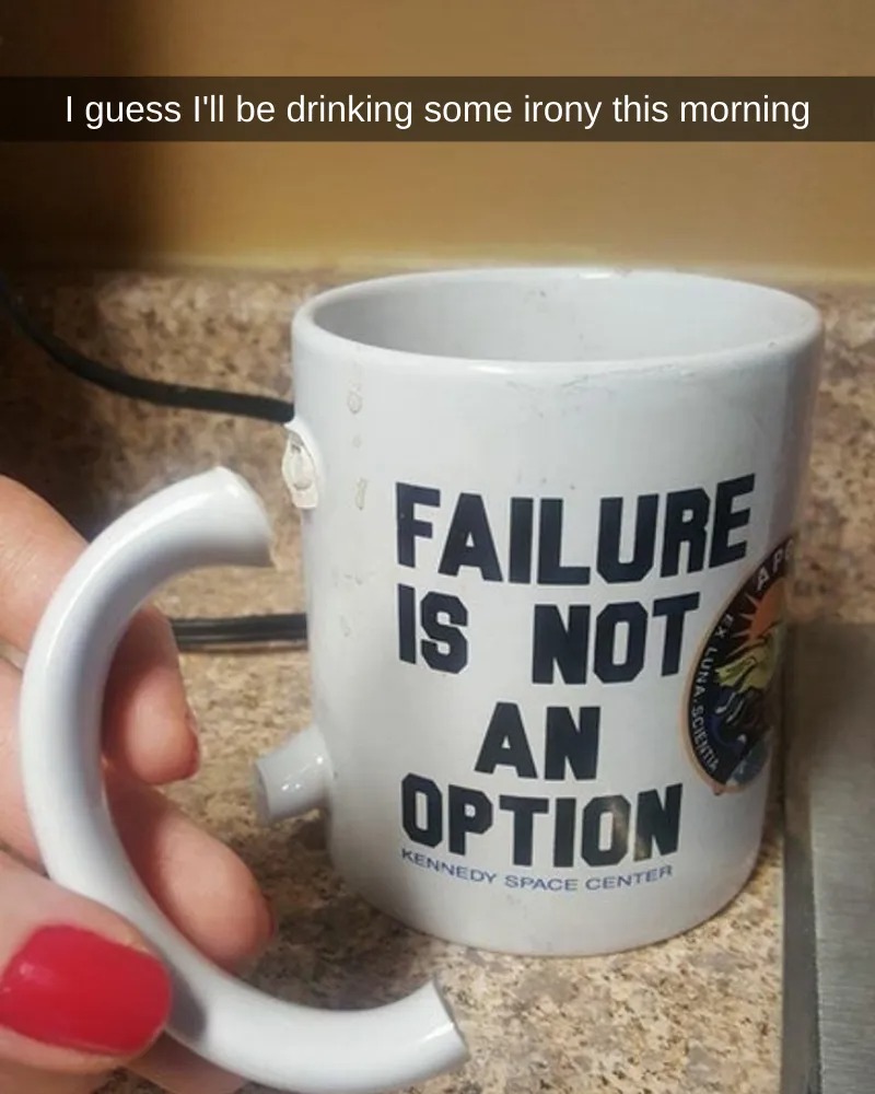 You heard the mug — failure is not an option, even if the handle on your favorite coffee mug breaks off as you take your first sip of coffee in the morning. Life can be rough, and this picture only proves that.