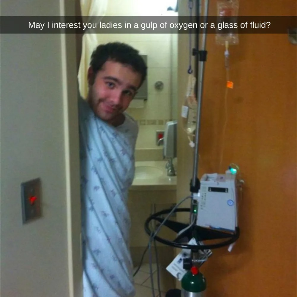 He may be dressed in a hospital gown and walking around with an IV, but he’s here to show the ladies that he’s the ultimate catch. Any takers?