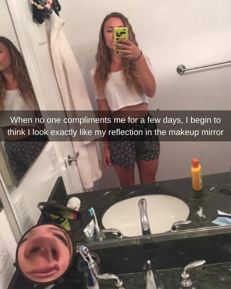 Sometimes all a gal needs is a little pick-me-up; a compliment of sorts that’ll just make her day. From the sounds of it, that’s what this little lady needs. She hasn’t received a compliment from anyone over the past few days and it’s really gotten to her — so much so that she’s beginning to believe she looks like the zoomed-in reflection of herself inside her makeup mirror.