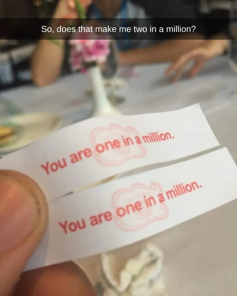 Here we go again with another fortune — this time minus the cookie. Now, if you’re going to write a ‘You are one in a million fortune, it’s probably best to make sure that the person who’s on the receiving end of the fortune doesn’t get it twice.