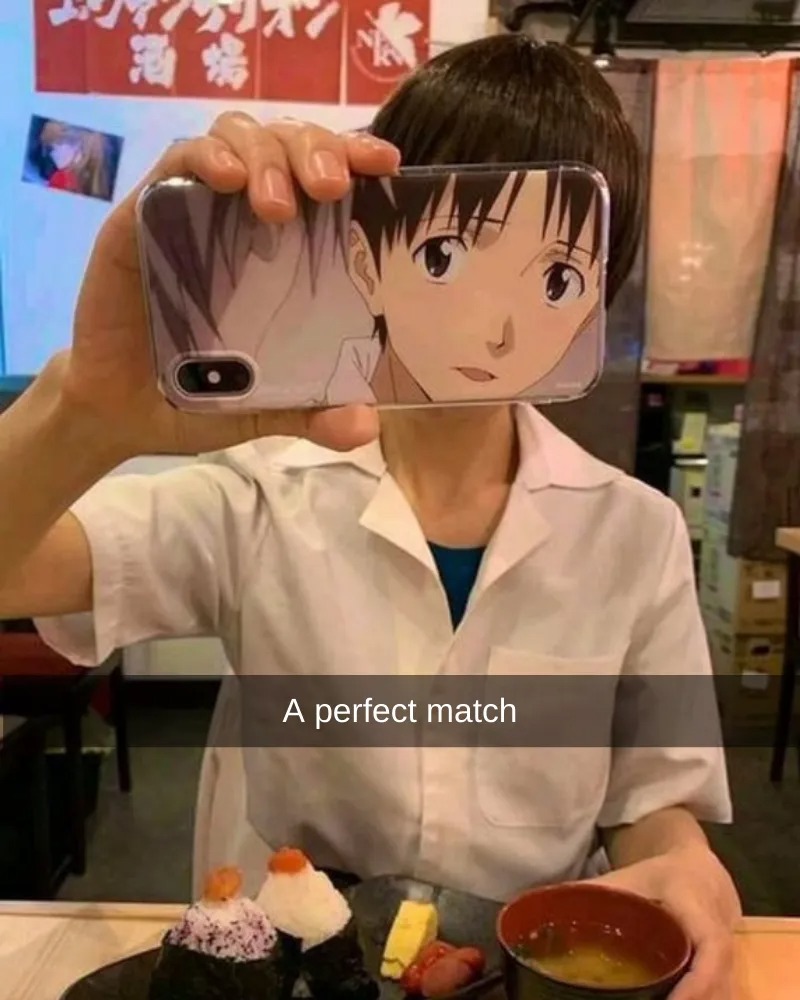 Whoever took this perfectly-timed photo honestly deserves a medal of some sort. The iPhone is so well-placed in front of the guy’s face that it really does look as though the anime character’s face on the back of the phone case belongs to the actual person sitting down at a Japanese restaurant.