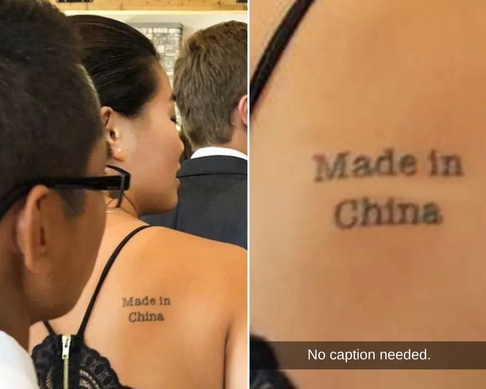 Now, although this woman isn’t an item of clothing, a toy, or an electronic, she wants to make it clear to the world that she indeed was made in and comes from China. And what better way to do that than to get an origin label tattooed on the back of your shoulder?