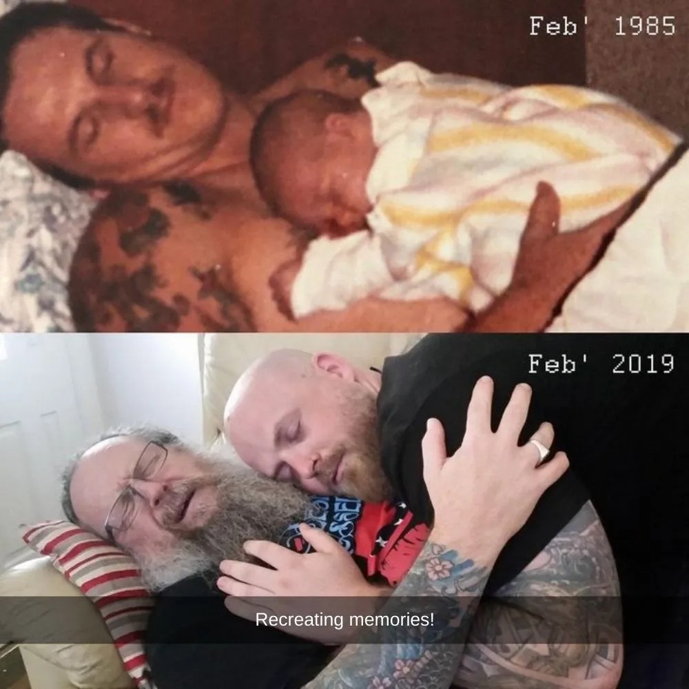 We’ve all seen those pictures or reels in which people recreate the fondest memories they’ve captured on film. This father and son decided to do the same. There’s one big difference, though.