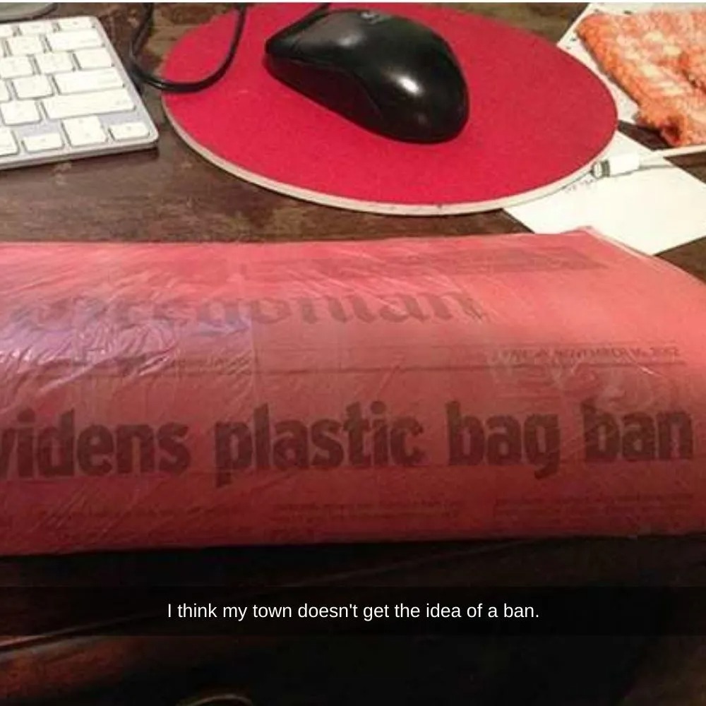This person wanted to share the fact that the town he was born and raised in clearly hasn’t learned the definition of “ban.” But, hey, at least the OP is able to recognize the irony in this picture.