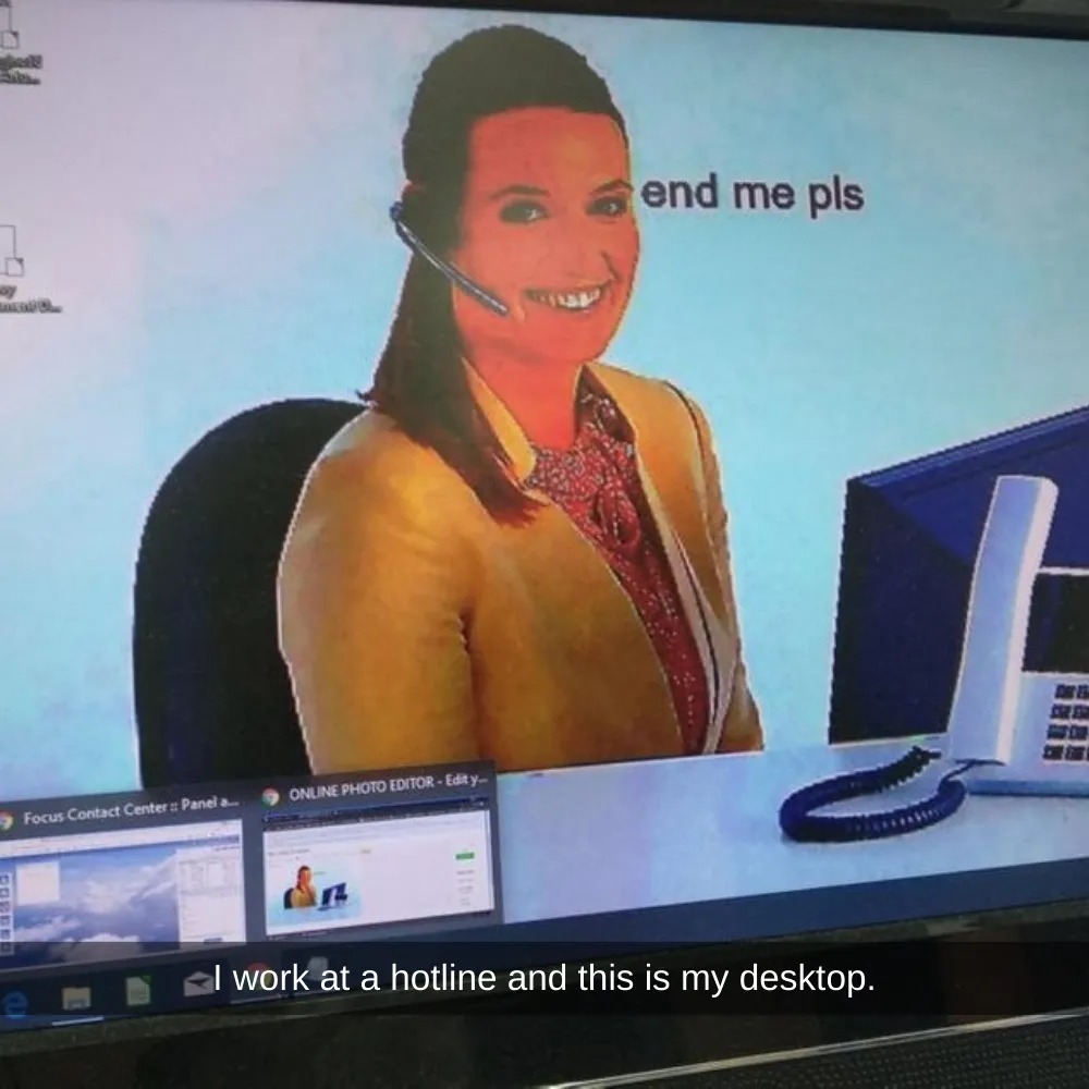 If you’re a fan of dark humor, then there’s a good chance you’ll like this next example of self-irony. This OP works for an emergency hotline specifically for people in need of mental health assistance. So, their desktop background is pretty ironic and even a bit cringe.