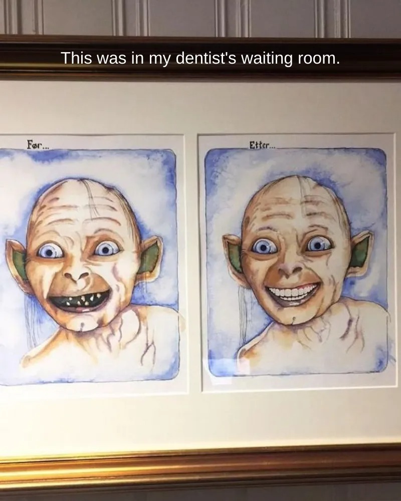 What better method to demonstrate your dental talents than by painting Gollum from The Lord of the Rings before and after? Perhaps the dentist only practices dentistry during the day and is an artist at night.