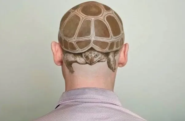 We just hope this guy never suffers from male-pattern baldness later in life. Getting a head or face tattoo is a bad idea, since their really hard to cover up. At least the tortoise looks pretty cute!