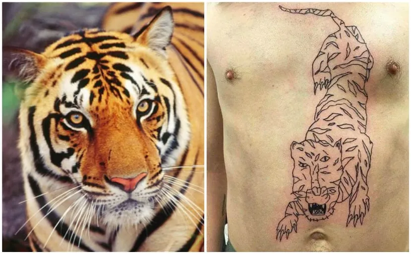 We couldn’t find the source material for the tattoo on the right, so we put a picture of an actual tiger on the left for reference. At first, we had no idea what we were looking at, but then we saw the eyes.