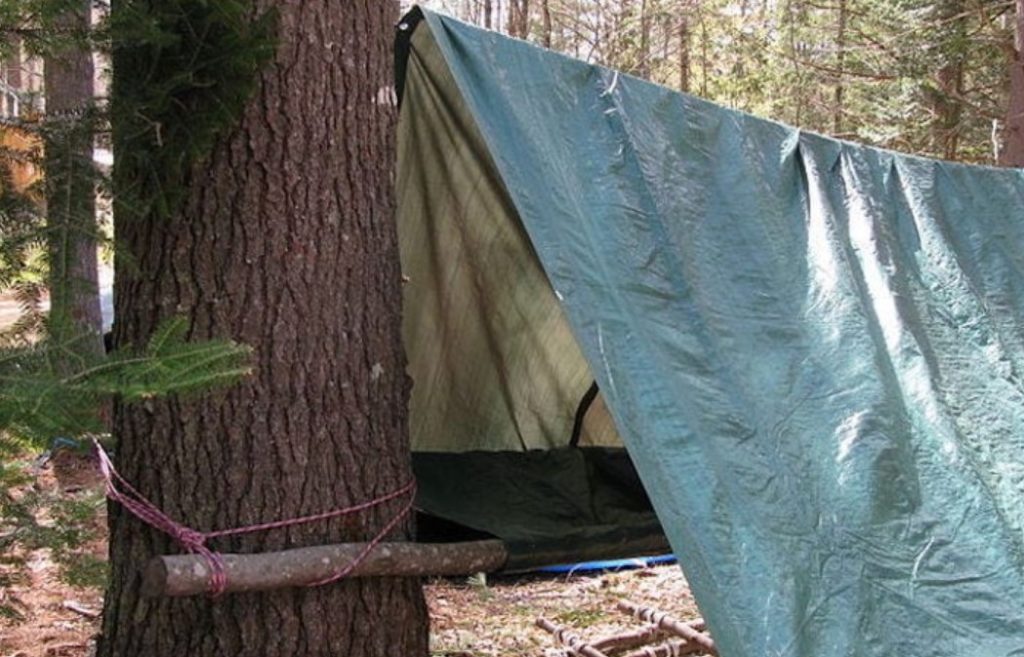 The trail of trash lead them to a clearing, where they found other signs of habitation. There was a makeshift camp, surrounded by water bottles that were hanging from the trees. A large tarp was hung in the middle of the campsite as a rudimentary shelter. Suddenly, a man appeared from beneath the tarp and their eyes widened in disbelief. Frightened, the foragers ran.