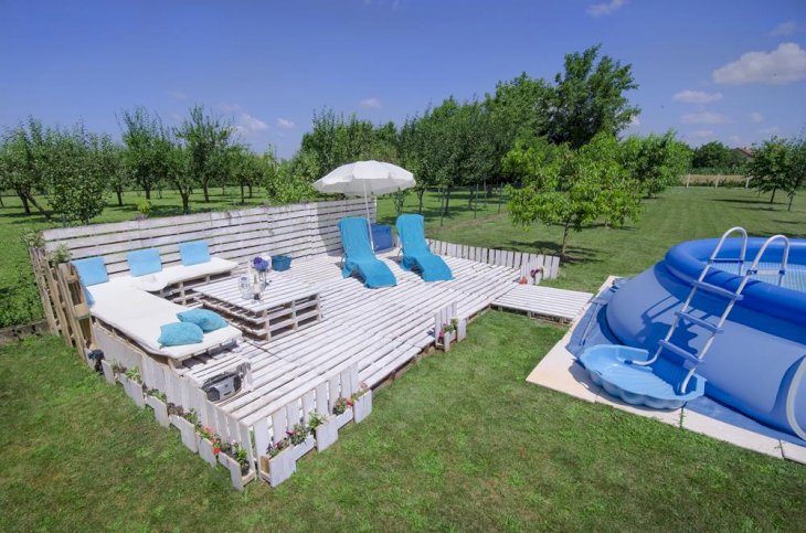 It turned out to be a magnificent sofa + deck! The seating area, the table and fencing were all made using the pallets, and the choice of color, coupled with her décor made it look absolutely stunning.
